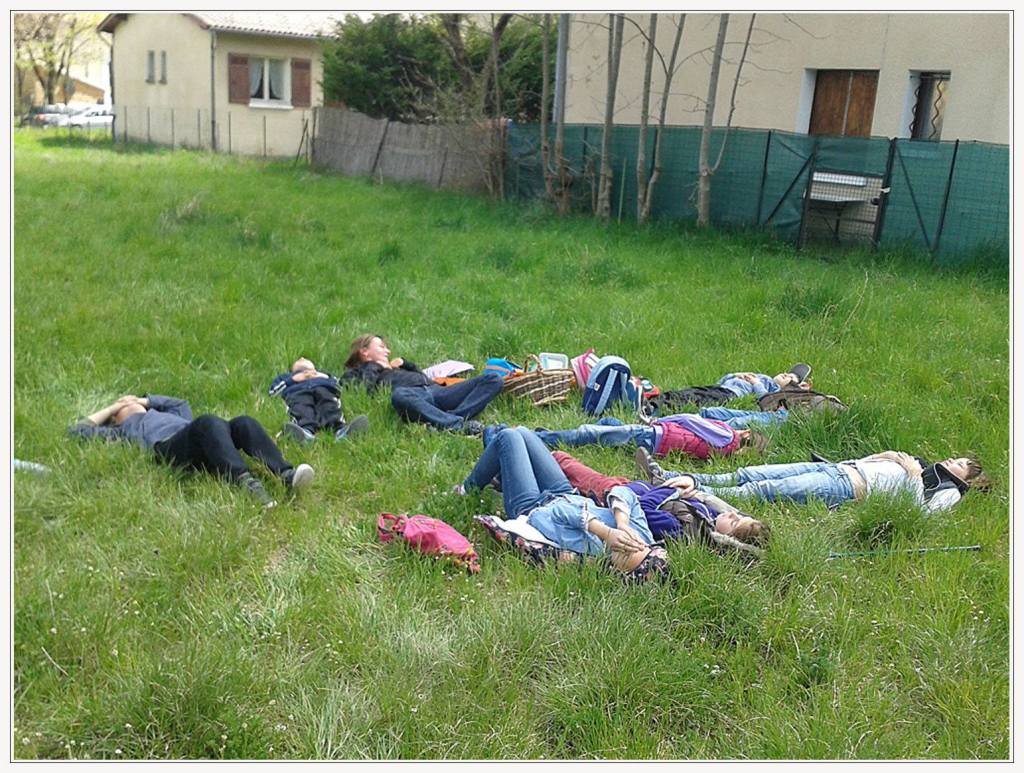 Actions : Parcourir une ville, une forêt, un parc… De temps à autre, selon les points d’ouïe, scènes sonores, s’allonger sur le sol, écouter, se laisser totalement immerger, yeux fermés… Jalonner son parcours d’écoutes allongées, les comparer, les commenter….