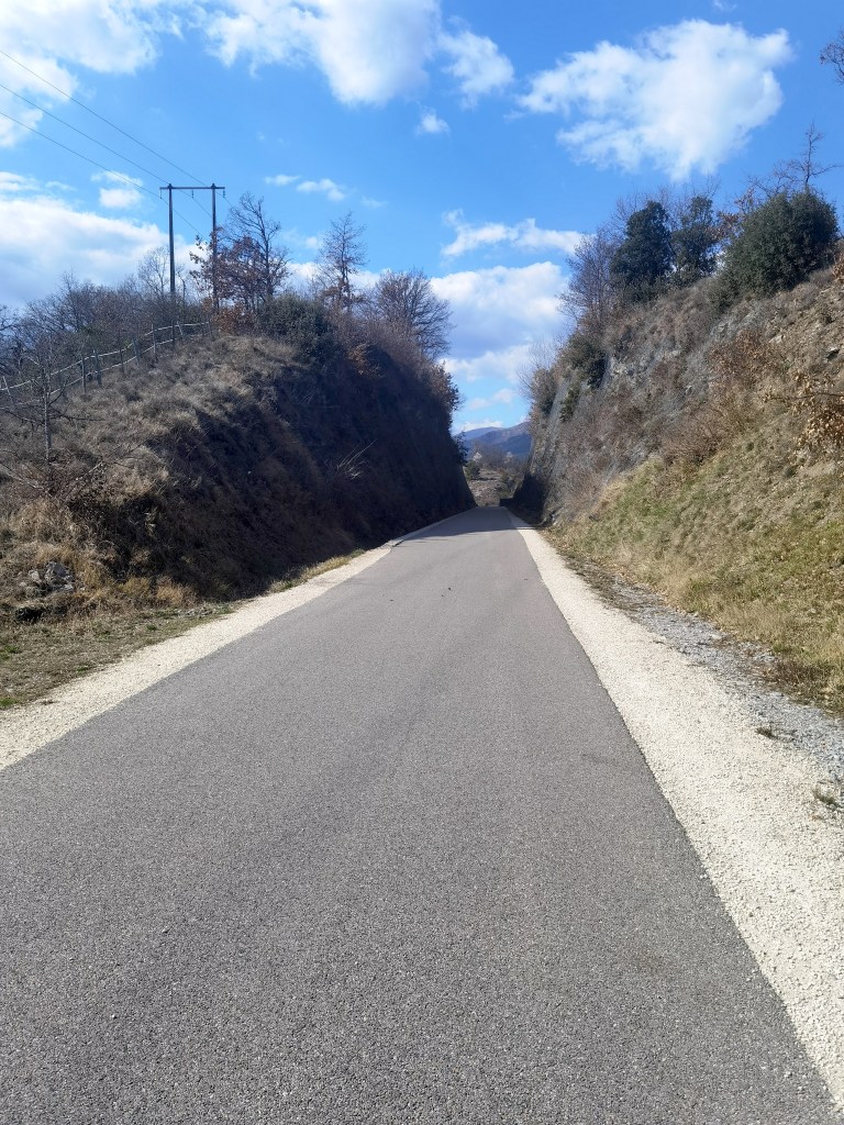 Revêtement – Un long ruban goudronné, assez lisse, peu sonore; il faut faire un pas de côté, sur les bas-côtés, pour entendre bruisser nos pieds foulant le gravier et les feuilles mortes, textures écrasées, et en jouer…