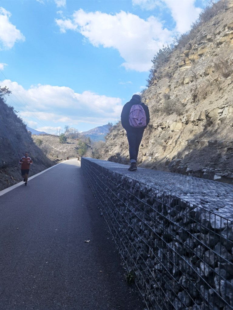 Passages et flux – Croisements ponctuels de marcheurs et cyclistes, assez rares en ce jour pourtant ensoleillé. Certains d’entre eux, sur deux roues, agacés par la lenteur des bipèdes flâneurs, jouent de la sonnette autoritaire, d’autres sourient, s’annoncent plus amènes… Cohabitations de mobilités parfois contrariées…