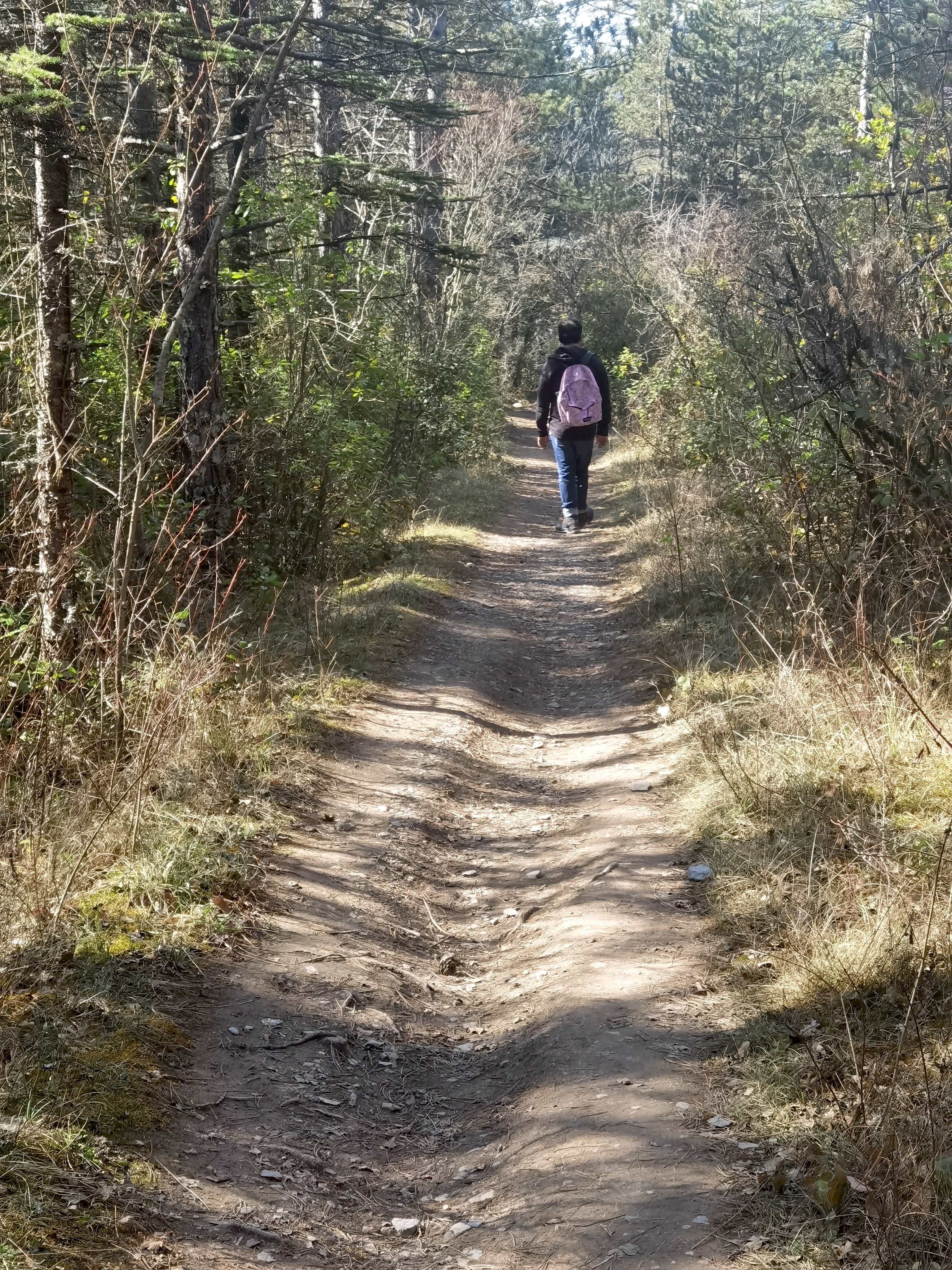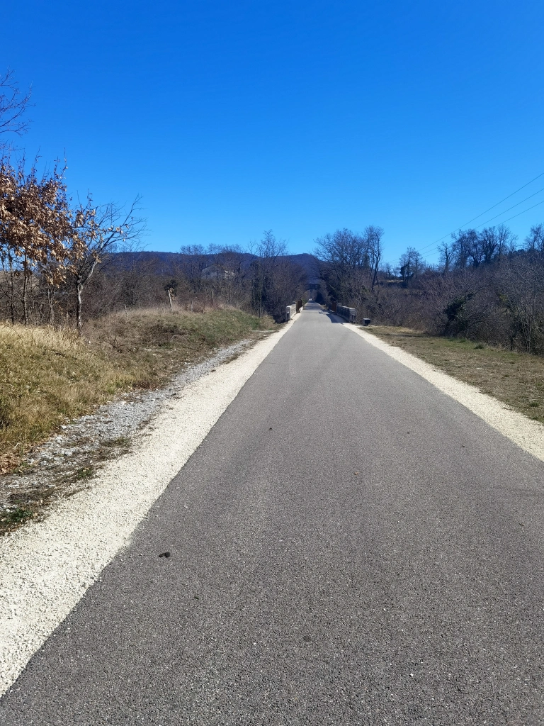 Revêtement – Un long ruban goudronné, assez lisse, peu sonore; il faut faire un pas de côté, sur les bas-côtés, pour entendre bruisser nos pieds foulant le gravier et les feuilles mortes, textures écrasées, et en jouer…