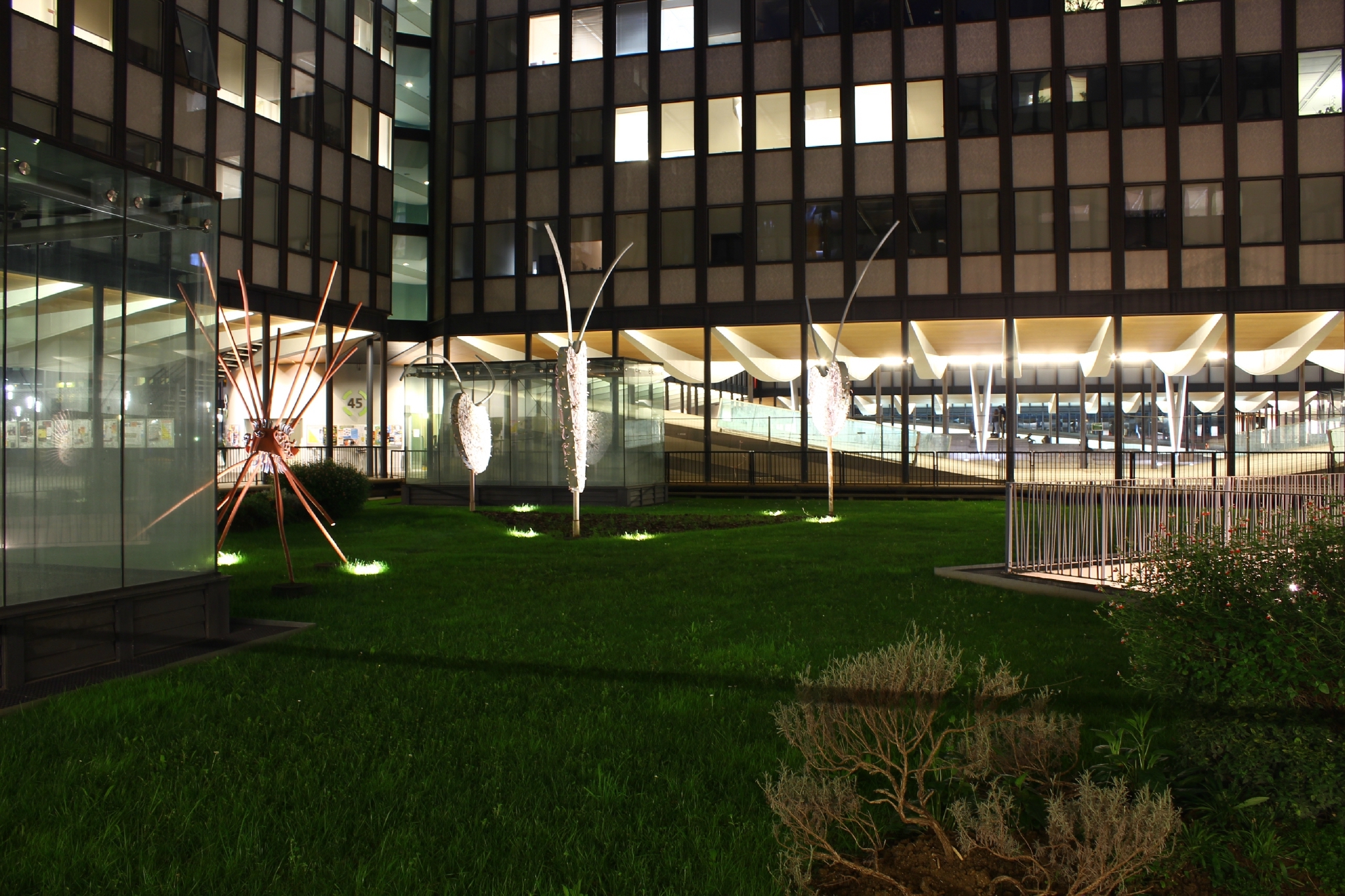 Un passage en passerelle surplombe la bibliothèque universitaire. Nous pouvons voir des étudiants, en contrebas, lire et écrire, se déplacer pour aller chercher tel ouvrage. Il est alors aisé d’imaginer l’atmosphère très calme de la BU, tout en la regardant vivre en silence, sans rien en entendre, impression curieuse. Nous percevons les sons de surface, derrière nous, d’ailleurs très discrets, tout en voyant un autre univers sonore, dans un mixage que chacun peut se faire à son gré. Un décalage dedans-dehors, dessus dessous, qui ne manque pas, en cette nuit tombante, d’une certaine poésie. Espace apaisé où l’imaginaire a toute sa place.