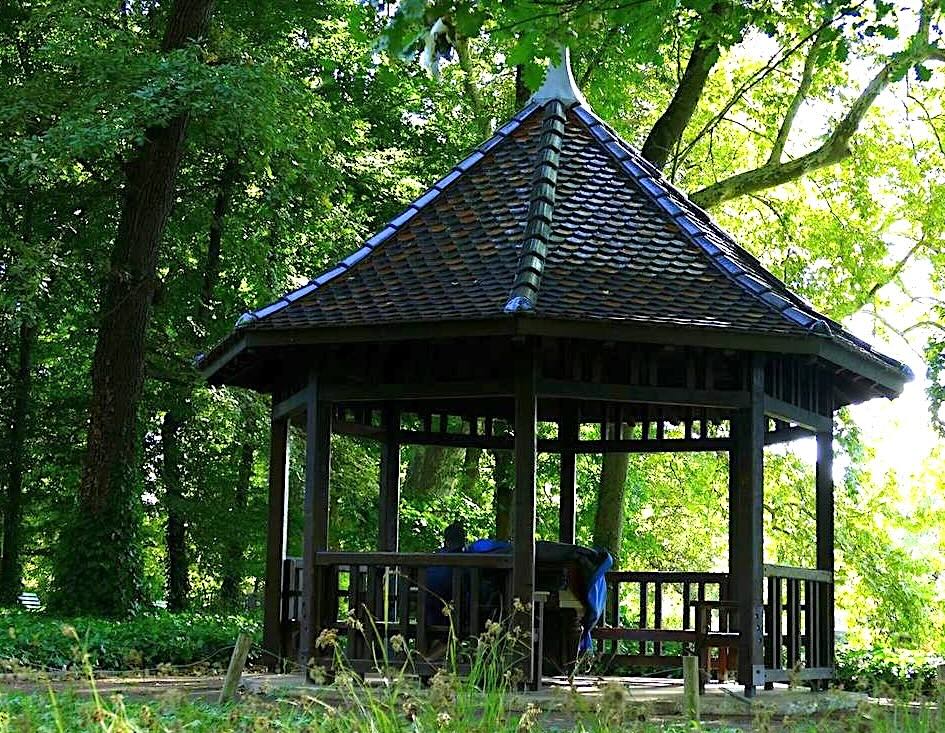 Je me place au centre d’un ancien kiosque à musique, dans un parc municipal. Je perçois un panoramique auditif qui m’amène les sonorités ambiantes à portée d’oreille. Je ne produis aucun son, je les accueille, au centre de cette architecture singulière.