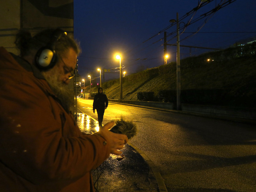 Première phase, un repérage, très pluvieux ce matin là. On arpente le quartier à la recherche d’ambiances, de sources sonores originales, ou non, de points d’écoute qui accrochent à la fois l’œil et l’oreille.