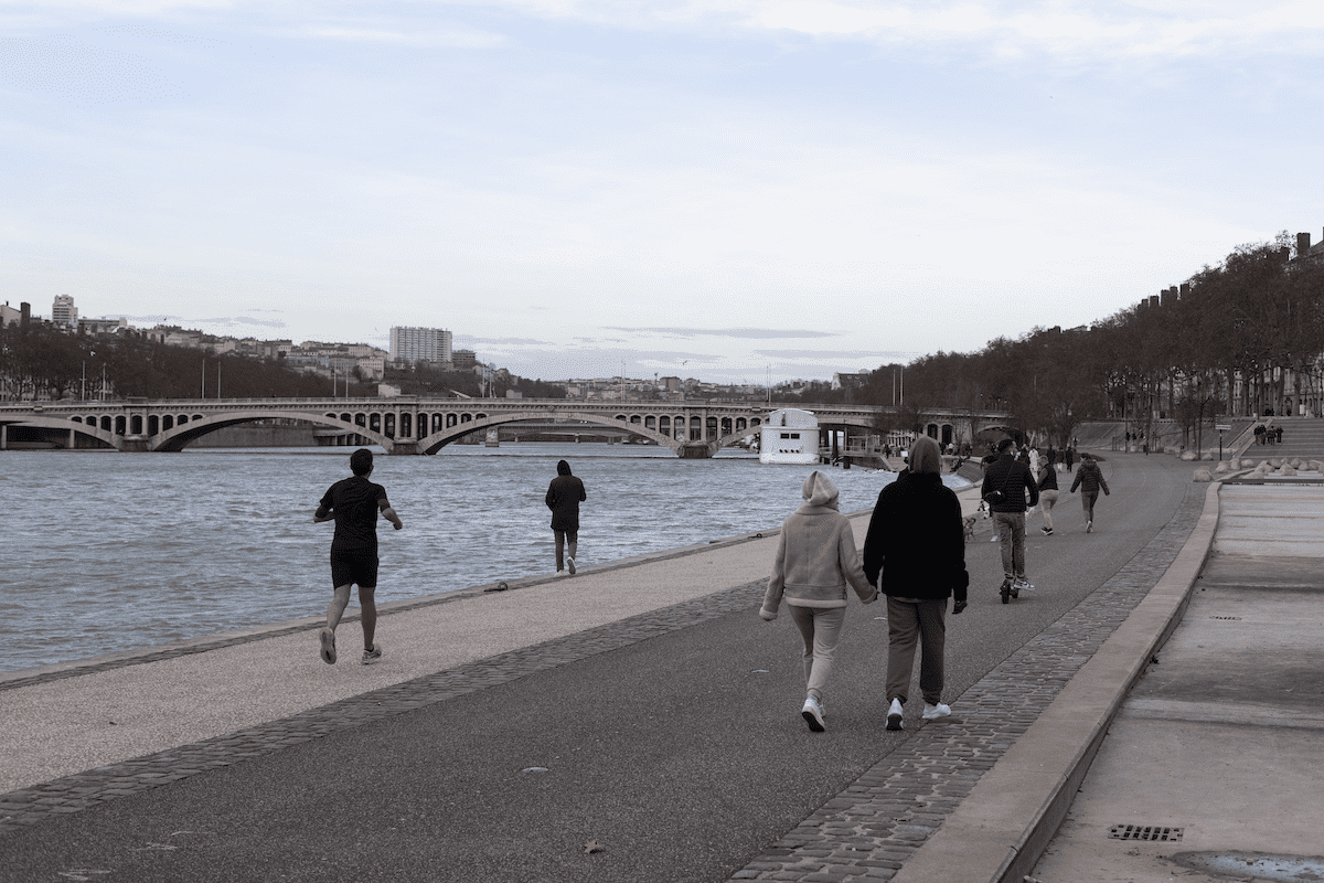 Néanmoins, de nombreux joggers et joggeuses font leur exercice sportif, les rythmes de leurs courses et de leurs respirations scandent les quais de claquements et halètements.