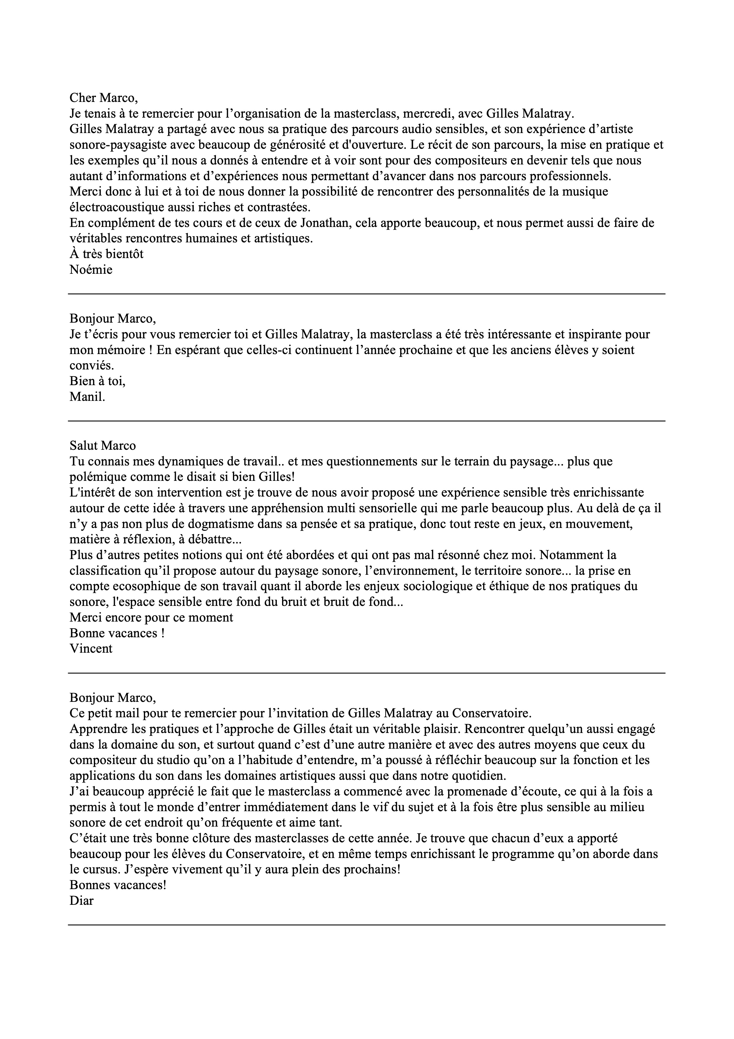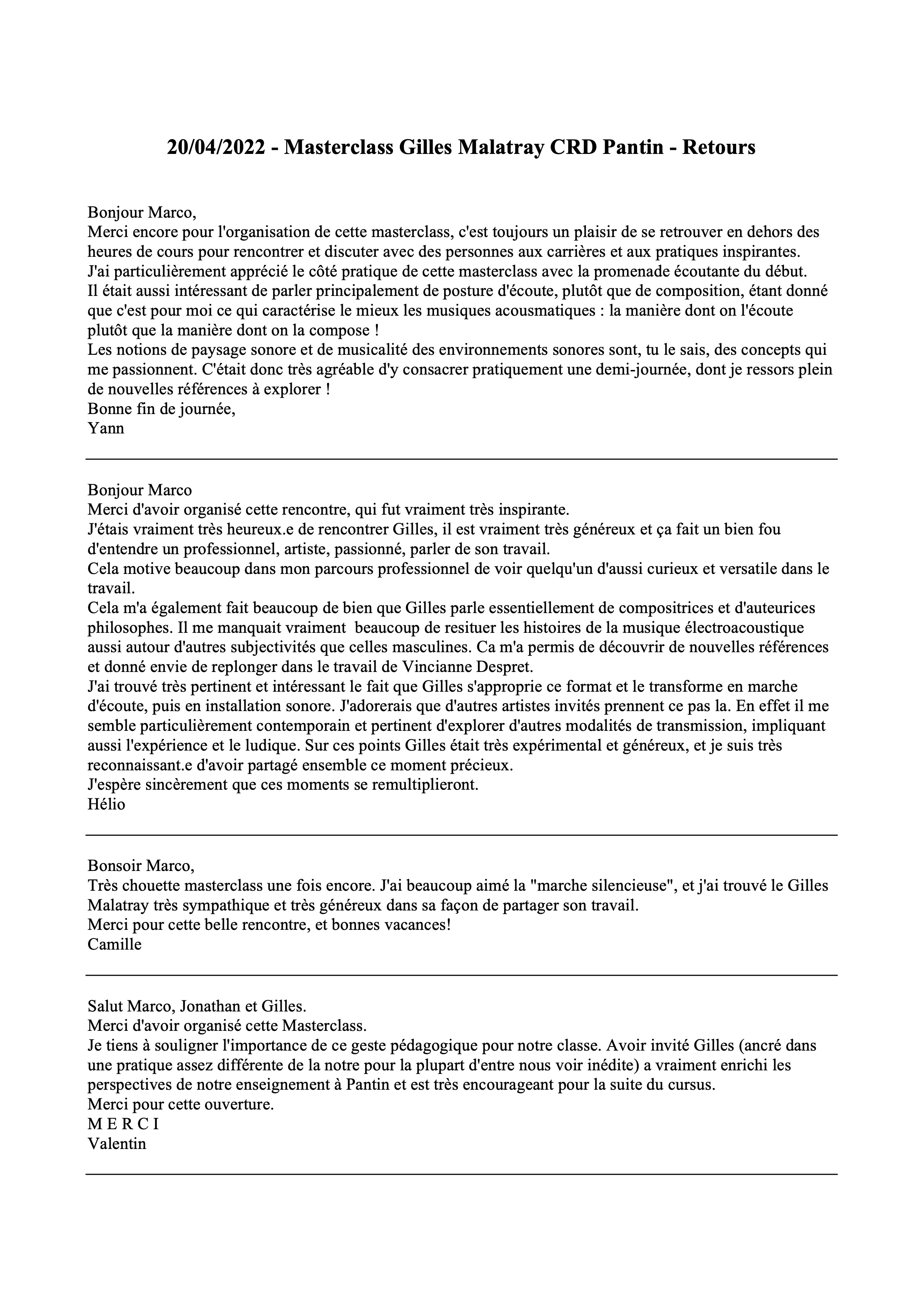 Ces question n’ont pas forcément de réponses définitives, et c’est heureux, car il nous reste encore un beau champ d’investigations concernant l’installation d’écoutes, situations où la corporalité est convoquée dans toute sa mobilité intrinsèque, où que porte notre écoute.